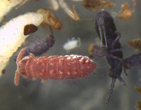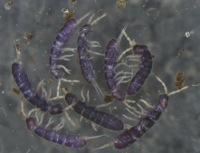 Une seconde cible sera les agents du microbrassage de la matière organique morte, bien moins spectaculaire mais, indispensable à la dégradation de ces molécules carbonées et azotée, issus de la photosynthèse et incorporées dans le sol. Au travers de la fragmentation des débris végétaux, le transport, le"remalaxage" des produits des déjections assurés par la mésofaune (Acariens, Collemboles), Les ETMs sont concentrés dans ces chaines trophiques. En effet, les ETMs « récupérés » dans les bactéries consommés par les protozoaires qui les concentrent, eux-mêmes consommés par les nématodes, à leur tour proies des acariens et des prédateurs supérieurs. Mais bon nombre des éléments (et donc des ETM) sont non digérés par leurs prédateurs et se retrouvent dans leur fèces qui elles sont re-ingurgitées par les arthropodes détritivores (Collemboles et certains Acariens) (Gobat et al., 2004). Les collemboles seront notre deuxième cible. En effet ceux ci, d’un point de vue physiologique fabriquent à l’intérieur de leur propre corps des cristaux d’urates qui seraient susceptibles d’isoler les éléments toxiques. Cristaux que nous pensons pouvoir analyser avec la résolution très fine de l’ablation laser.