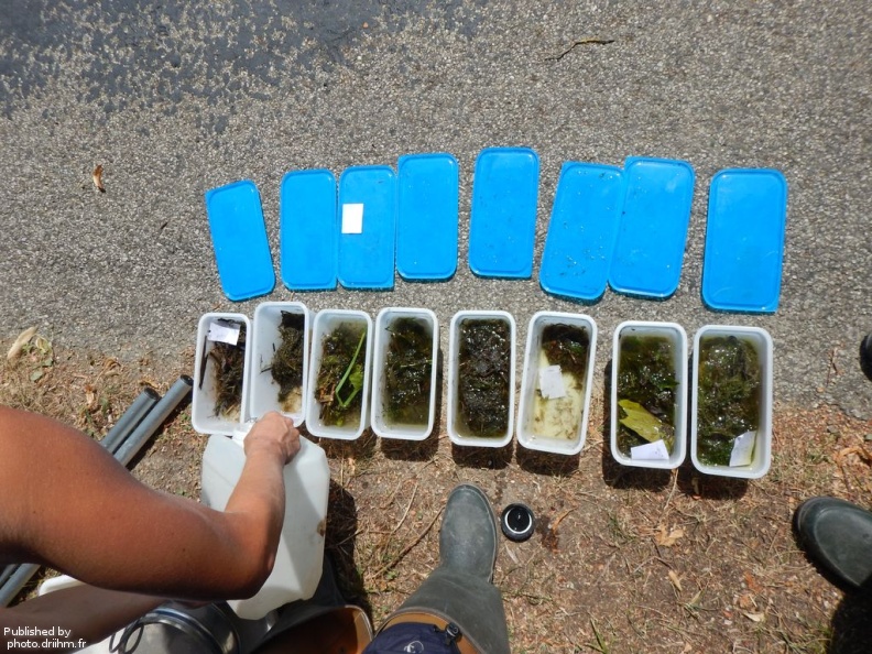 Echantillons élémentaires de macrofaune en train d'être fixés à l'alcool