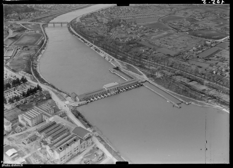 Vue aérienne du barrage-usine-écluse de Cusset sur le canal de Jonage, mis en service en 1899 (vue vers l'aval)