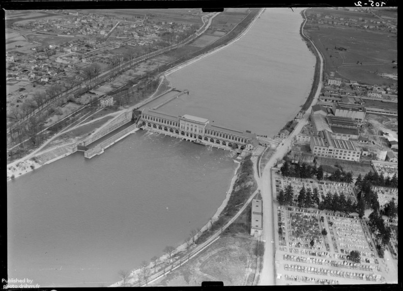 Vue aérienne du barrage-usine-écluse de Cusset sur le canal de Jonage, mis en service en 1899 (vue vers l'amont)