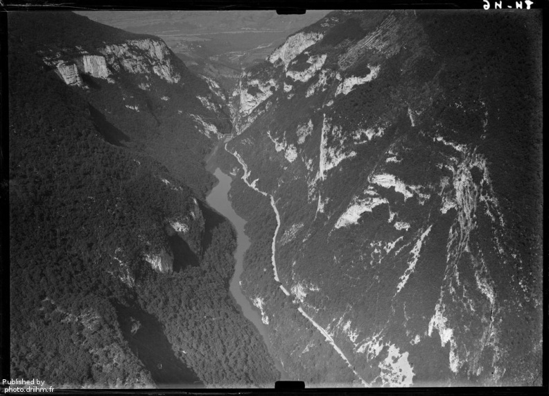 Vue aérienne de la retenue du barrage hydroélectrique de Motz, dans les gorges du Fier, mis en service en 1920 (vue vers l'aval)