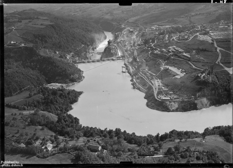 Vue aérienne de la retenue de Génissiat, mise en eau en janvier 1948 (vue vers l'aval)