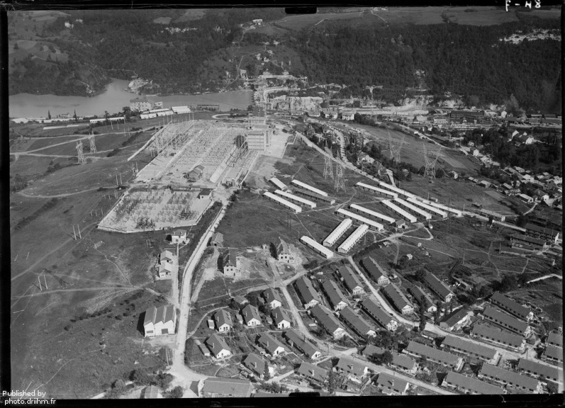 Vue aérienne du poste électrique RTE du barrage de Génissiat (vue vers le sud-est)