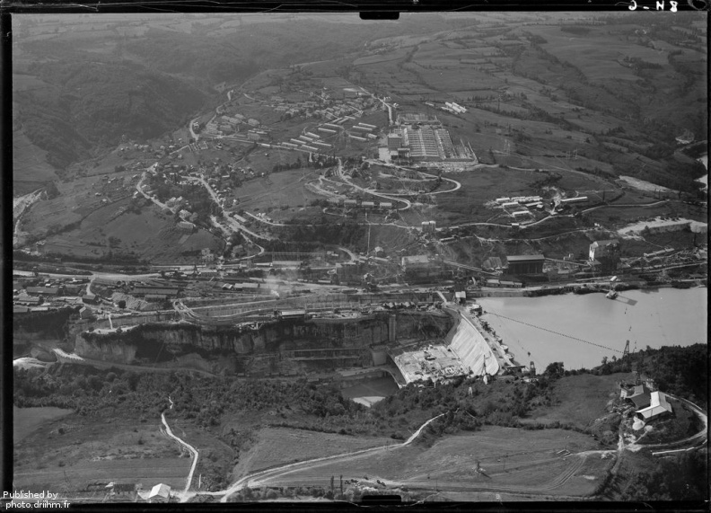 Vue aérienne du barrage hydroélectrique de Génissiat depuis la rive gauche du Rhône (vue vers le nord-ouest)