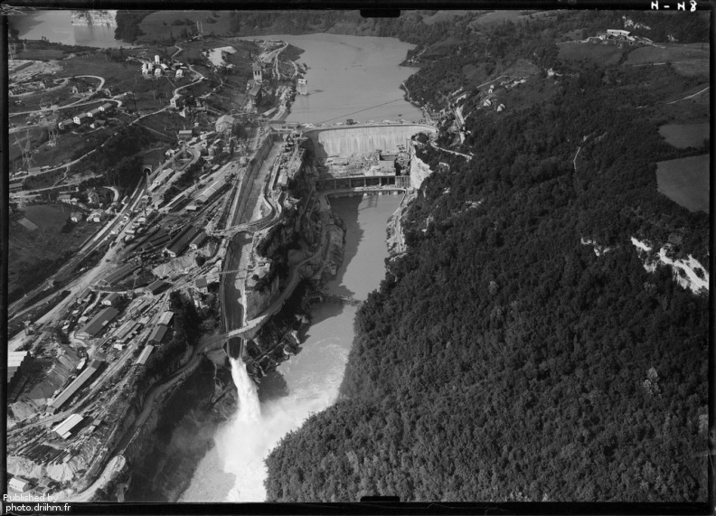 Vue aérienne du barrage hydroélectrique de Génissiat et du canal évacuateur de crue. Le barrage est mis en eau en janvier 1948 et inauguré le 1er août 1948 par le Président de la République Vincent Auriol. Il s'agit alors du plus important barrage d'Europe (vue vers l'amont)