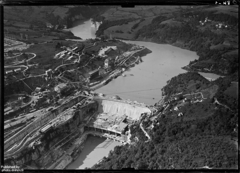 Vue aérienne du barrage hydroélectrique de Génissiat, mis en eau en janvier 1948 et inauguré le 1er août 1948 par le Président de la République Vincent Auriol. Il s'agit alors du plus important barrage d'Europe (vue vers l'amont)