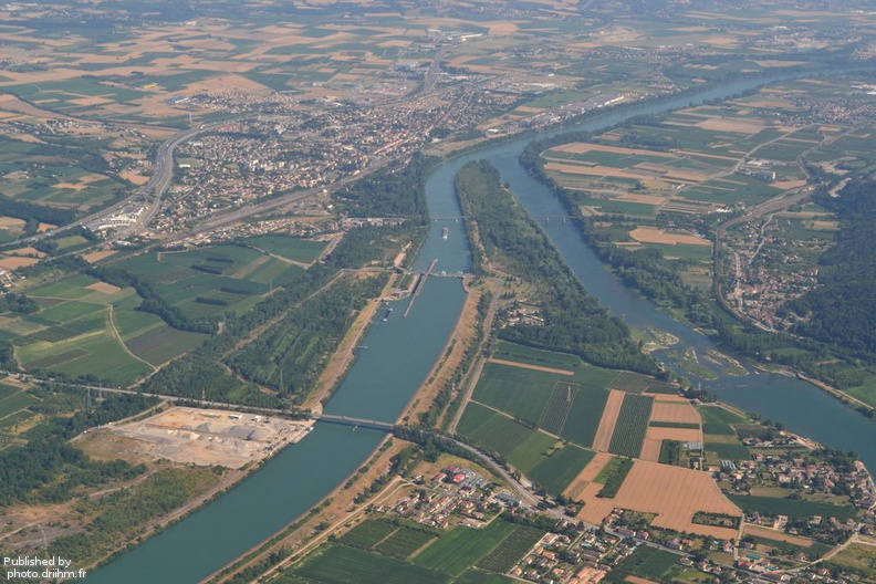 Fin du Rhône court-circuité de Péage-de-Roussillon. Usine et écluse de Sablon (Canal). Seuil Peyraud (Vieux Rhône). Vue vers l'aval