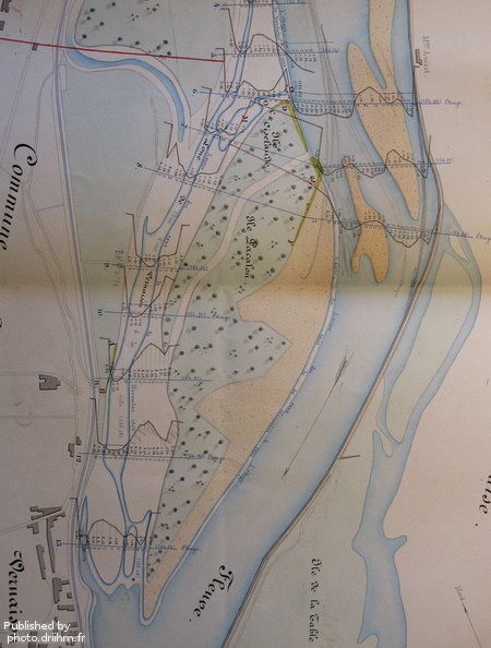 Original title (in French): Constatation des changements survenus dans la lône de Vernaison pendant la crue de 1863. English title: Observation of the changes in the abandoned Vernaison channel during the 1863 flood.
